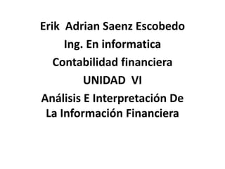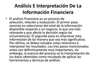 Este documento presenta una introducción al análisis e interpretación de la información financiera. Explica que el análisis financiero implica seleccionar, relacionar y evaluar la información más relevante de los estados financieros para tomar decisiones. Luego, describe los objetivos del análisis financiero como ayudar a predecir el futuro desempeño de un negocio. Finalmente, resume los principales métodos de análisis financiero, incluidos el análisis vertical, razonas simples, análisis horizontal y tendencias porcent