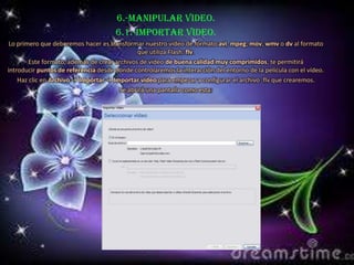 1) Importar video al formato FLV, 2) Exportar video de Flash, 3) Editar video mediante recorte y cambio de tamaño, 4) Aplicar efectos como dibujos y transformaciones, 5) Establecer áreas de fundido y 6) Comprimir video para reducir su tamaño.