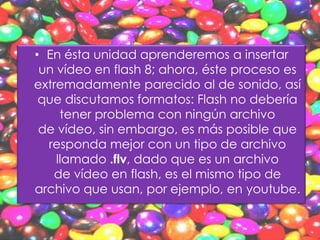 Este documento explica cómo manipular video en Flash, incluyendo cómo importar, exportar, editar y comprimir video, así como aplicar efectos. Explica que es más fácil importar videos en formato FLV y que para exportar un video se selecciona Archivo > Exportar > Exportar Video. También cubre estándares de compresión como Motion-JPEG y MPEG.