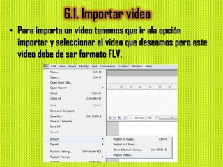 Este documento proporciona instrucciones sobre cómo importar, exportar, editar, aplicar efectos, comprimir videos y manejar clips de película en Flash. Explica que los videos deben estar en formato FLV para importar, cómo exportar en diferentes formatos, editar en la línea de tiempo, aplicar efectos a través de las propiedades y comprimir videos con un programa externo. También indica que los videos se pueden manejar como animaciones en Flash.