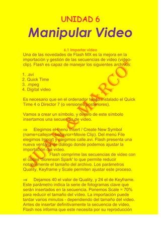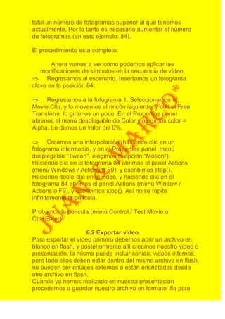 El documento describe los pasos para importar, exportar, editar y aplicar efectos a videos en Flash, así como comprimir videos. Se explica cómo importar videos en diferentes formatos a Flash, exportarlos como swf o avi, editarlos mediante herramientas como cortes o interpolaciones, aplicar efectos como desenfoque o transformaciones, y comprimir videos swf usando un programa gratuito para reducir su tamaño.