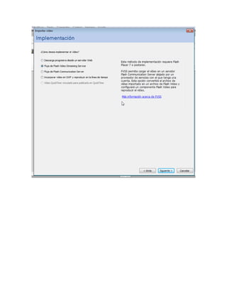 Este documento describe los pasos para importar, exportar, editar, aplicar efectos, comprimir video y manejar clips de película en Flash, incluyendo importar video a la biblioteca, exportar video en un formato específico, editar video y agregar efectos con Flash Encoder, comprimir video para publicación, y usar ActionScript para modificar clips de película.