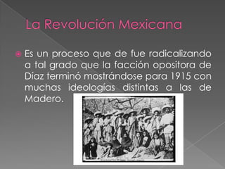La Revolución Mexicana estuvo compuesta por tres revoluciones distintas - nacionalista, agraria y obrera. Aunque la primera se impuso, liderada por Madero y luego Carranza, la participación de Estados Unidos y las fuerzas de Villa y Zapata significaron que la lucha continuó por varios años hasta que el nuevo gobierno de Obregón comenzó la reconstrucción en 1920.