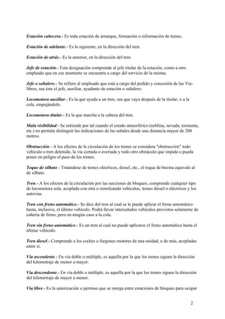 Este documento define varios términos técnicos relacionados con el ferrocarril y describe los componentes básicos de una vía férrea, incluyendo rieles, durmientes y balasto. También explica el sistema de bloqueo ferroviario y sus objetivos de controlar el tráfico de trenes entre estaciones de manera segura.