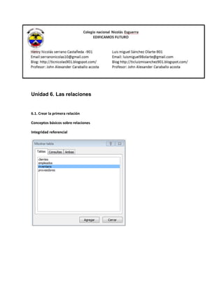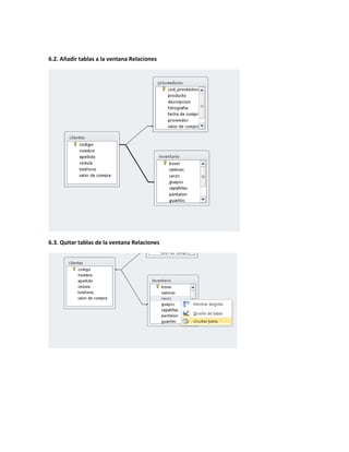 Este documento describe cómo crear y modificar relaciones entre tablas en una base de datos. Explica cómo añadir, quitar y eliminar tablas de la ventana de relaciones, así como modificar y eliminar relaciones existentes. También cubre cómo visualizar relaciones directas y todas las relaciones entre tablas.