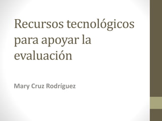 El documento describe varios recursos tecnológicos para apoyar la evaluación, incluyendo Google Forms, Guizziz y el aprendizaje basado en juegos. Google Forms permite crear encuestas y exámenes de forma fácil. Guizziz es una herramienta para crear juegos educativos que pueden usarse para la enseñanza y la evaluación. El aprendizaje basado en juegos motiva a los estudiantes y les permite aprender de manera activa.