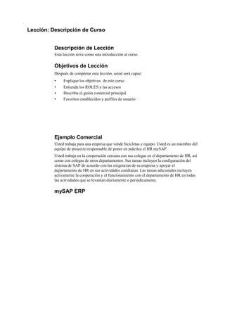 Este documento presenta la unidad 6 de un curso. La unidad introduce los objetivos del curso y cubre temas como roles de acceso, el guión comercial principal, y cómo establecer favoritos y perfiles de usuario. Incluye un ejercicio para que los estudiantes configuren parámetros de usuario y roles, y guarden un elemento como favorito después de completar la lección introductoria.