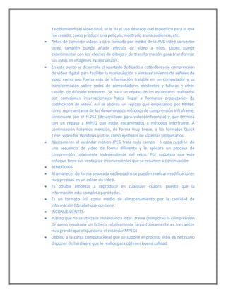 Este documento explica cómo insertar un video en Flash y los pasos para convertir un video a formato FLV, el cual es compatible con Flash. Primero se debe convertir el video a formato FLV usando un programa de edición de video. Luego en Flash, se importa el archivo FLV mediante el menú Archivo > Importar > Importar video. Finalmente, se exporta el proyecto de Flash con el video insertado para obtener el video final en un formato como MP4, AVI o MPEG.
