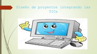 El documento describe el proceso de diseño y planeación de proyectos educativos que integran las tecnologías de la información y la comunicación (TICs). Explica que este proceso implica definir objetivos educativos, seleccionar un problema, desarrollar una metodología, planificar acciones, evaluar resultados y derivar conclusiones y recomendaciones. La metodología incluye analizar la situación educativa, seleccionar y definir el problema, establecer objetivos, analizar soluciones posibles, planificar actividades y recursos, y dise