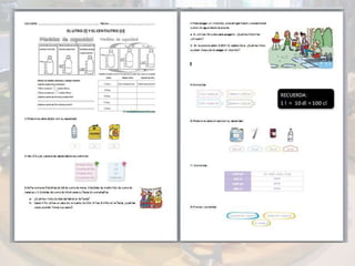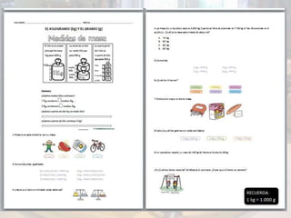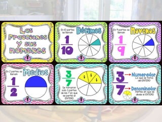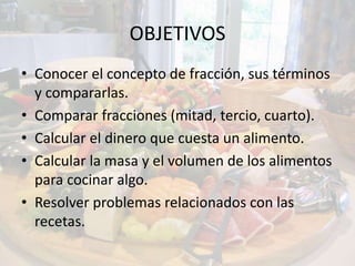 Este documento presenta una unidad didáctica de 3 semanas sobre fracciones. Los objetivos son conocer conceptos de fracciones como mitad, tercio y cuarto, calcular cantidades de alimentos usando fracciones y unidades de masa y volumen, y resolver problemas relacionados con recetas. Los contenidos incluyen cálculo de fracciones, operaciones con dinero, y medidas como kilogramos, gramos, litros y centilitros. Se enseñan estas ideas a través de ejemplos de repartir comida y una receta de crepes.