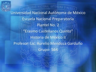 El documento resume la historia de México en la década de 1940. Algunos de los principales puntos son: 1) Manuel Ávila Camacho asumió la presidencia en 1940 con un enfoque en la unidad nacional. 2) Se consolidaron logros laborales y educativos del gobierno anterior de Cárdenas. 3) Miguel Alemán Valdés ganó la presidencia en 1946 impulsando la industrialización. 4) México experimentó un periodo de estabilidad y crecimiento económico conocido como el "Milagro Mexicano".