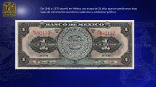 De 1945 a 1970, México experimentó un período de 25 años de alto crecimiento económico sostenido y estabilidad política. Se terminaron las rebeliones militares y las elecciones se celebraron de manera periódica y regular. Los ambiciosos proyectos de modernización del Estado unieron al grupo en el poder y fortalecieron el poder presidencial.