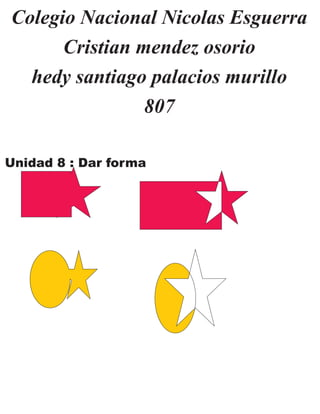 El documento proporciona información sobre tres estudiantes del Colegio Nacional Nicolas Esguerra: Cristian mendez osorio, hedy santiago palacios murillo y su número de identificación 807. Además, menciona la unidad 8 sobre dar forma a objetos y recortarlos e indica el término "intersección".