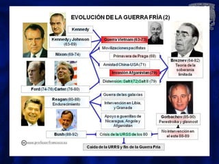 Este documento resume la Guerra Fría entre 1945 y 1990, cuando Estados Unidos y la Unión Soviética emergieron como las dos superpotencias rivales luego de la Segunda Guerra Mundial. Describe los orígenes del conflicto, la división del mundo en bloques de poder capitalista y comunista, y algunos de los principales puntos de tensión como la crisis de Berlín, la guerra de Corea, la crisis de los misiles en Cuba y la guerra de Vietnam. También menciona las "guerras periféricas" en otros países donde las superpotencias se enfrent