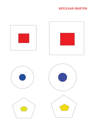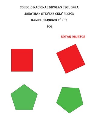 Este documento contiene información sobre tres estudiantes de un colegio y cuatro tópicos relacionados con rotar, reflejar, posicionar e inclinar objetos.