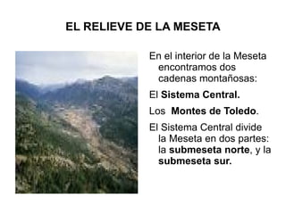 Este documento describe las principales formas del relieve en España. Detalla las montañas, llanuras y costas que componen el territorio español, incluyendo la Meseta Central, las cordilleras que la rodean como los Montes de León y la Cordillera Cantábrica, y las cordilleras exteriores como los Pirineos y los Sistemas Béticos. También menciona las dos grandes depresiones de España: la depresión del Ebro en el noroeste y la depresión del Guadalquivir en el suroeste.