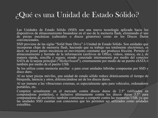 Las unidades de estado sólido (SSD) son dispositivos de almacenamiento que utilizan memoria flash para eliminar partes mecánicas, lo que resulta en una gran velocidad de lectura y escritura, así como en una mayor resistencia a golpes y vibraciones. Existen dos arquitecturas principales, basadas en DRAM y NAND flash, cada una con sus ventajas y desventajas, y los SSD se destacan por ser más silenciosos y consumir menos energía que los discos duros tradicionales. A pesar de su alto costo por gigabyte, su rendimiento superior y características como un tiempo promedio entre fallos prolongado están llevando a un aumento en su adopción en el mercado.
