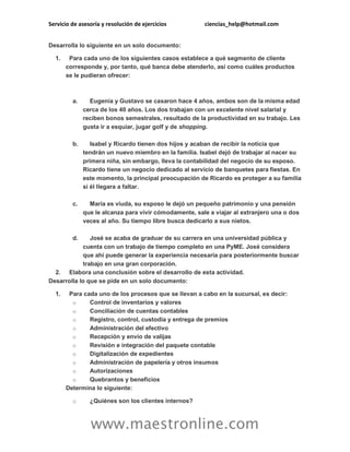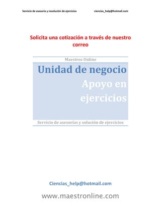 El documento ofrece servicios de asesoría y resolución de ejercicios a través del correo ciencias_help@hotmail.com o en la página web www.maestronline.com. Proporciona tutoría en diferentes asignaturas de ciencias para apoyar a estudiantes con sus tareas y ejercicios.
