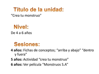 Este documento presenta una unidad didáctica de 4 sesiones para niños de 4 a 6 años sobre Halloween. La unidad incluye actividades como colorear fichas de conceptos como arriba/abajo y dentro/fuera, crear un monstruo con gelatina y galletas, y ver la película Monstruos S.A. Los objetivos son que los niños aprendan conceptos básicos y se familiaricen con la celebración de Halloween.