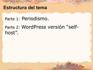 El documento habla sobre técnicas avanzadas de periodismo digital y el uso de WordPress para crear un periódico digital. Explica diferentes tipos de entrevistas, reportajes y críticas periodísticas, así como cómo instalar y personalizar temas y plugins en WordPress.