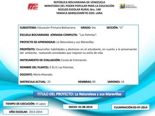 El documento presenta una unidad didáctica diseñada para estudiantes de 5to grado de la Escuela Bolivariana "Las Palmitas" con el propósito de desarrollar habilidades para la preservación del ambiente a través de diferentes actividades. La unidad abarca contenidos de lenguaje, matemáticas, ciencias sociales y se evaluará mediante escalas de estimación y pruebas escritas para medir el logro de los objetivos planteados.