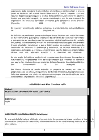 Este documento presenta una unidad didáctica sobre el tema "My Body" para estudiantes de 4o grado de primaria. La unidad se centra en el desarrollo de la competencia comunicativa básica en inglés a través de actividades de escucha, habla, lectura y escritura. Los objetivos generales incluyen el desarrollo de habilidades lingüísticas y de aprendizaje. La unidad evalúa la participación oral, comprensión auditiva y lectura, así como el interés y esfuerzo de los estudiant