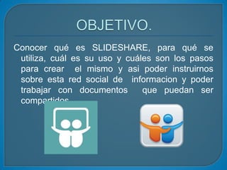 Slideshare es una plataforma web que permite a los usuarios subir y compartir presentaciones y documentos en diversos formatos, facilitando el intercambio de información tanto en entornos profesionales como educativos. Aunque se originó para uso corporativo, su funcionalidad se ha ampliado a un público más amplio, permitiendo la creación y difusión de contenido sin necesidad de enviar archivos pesados. El documento describe cómo utilizar Slideshare para alojar y compartir presentaciones creadas por estudiantes, abordando pasos específicos para la creación y publicación en la plataforma.