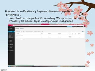 El documento habla sobre las entradas en Wordpress, que son publicaciones en un blog que Wordpress archiva y publica según la categoría asignada. Al hacer clic en "Añadir Nueva" se puede crear una nueva entrada para escribir información a publicar, y también se pueden crear categorías con nombre y descripción para organizar las entradas por tema, así como etiquetas que definen con más detalle el contenido de cada entrada.