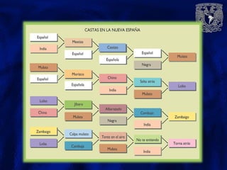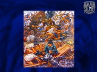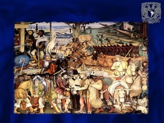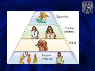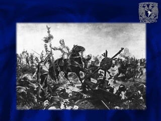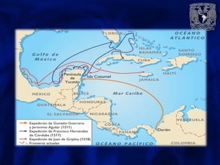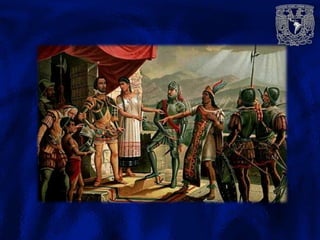 Este documento resume la historia de la civilización mesoamericana desde el período preclásico hasta la llegada de los españoles. Describe las principales culturas que florecieron como los olmecas, teotihuacanos y mayas. Explica que los españoles liderados por Hernán Cortés conquistaron el imperio azteca y establecieron el sistema colonial con repartos de tierras y encomiendas. Las reformas borbónicas aumentaron el control español pero también generaron descontento que llevó a las guerras de independencia