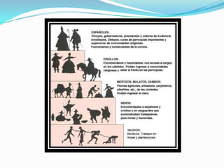 La Nueva España del siglo XVI al XVIII describe la sociedad, economía y gobierno de México durante el periodo colonial español. Aborda los antecedentes del México prehispánico y la conquista, la estructura política de la colonia, la economía novohispana, la sociedad colonial y la Santa Inquisición, así como las reformas Borbónicas que ocurrieron durante este periodo.