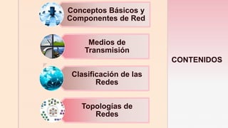 El documento proporciona una introducción a los conceptos básicos y componentes de las redes de computadoras. Explica qué es una red, sus objetivos y elementos clave como servidores, estaciones de trabajo, tarjetas de interfaz de red y sistemas de cableado. También describe diferentes tipos de medios de transmisión como el cobre, la fibra óptica y las redes inalámbricas, así como formas de clasificar y organizar las redes.