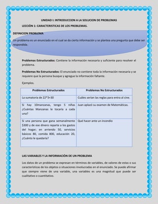 Este documento presenta una introducción a la solución de problemas. Explica que un problema es un enunciado que presenta información y una pregunta. Los problemas se pueden clasificar como estructurados o no estructurados dependiendo de si contienen toda la información necesaria. Las variables juegan un papel importante al identificar características cualitativas y cuantitativas en un problema. También se describe un procedimiento de seis pasos para resolver problemas que incluye leer el problema, identificar datos, plantear una estrategia, aplicarla, obtener una resp