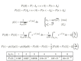 Este documento describe diferentes esquemas de transmisión digital, incluyendo transmisión en banda base y paso banda. Explica la modulación digital PAM, así como fuentes de error como ruido del canal e interferencia entre símbolos. También cubre detección óptima, incluyendo el filtro adaptado y reglas de decisión máxima probabilidad. Finalmente, analiza métodos de modulación sin memoria como ASK y constelaciones de señales.