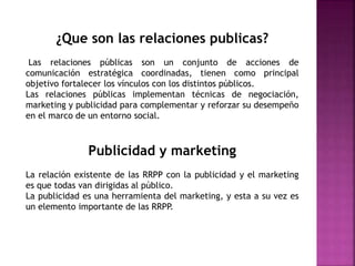 Este documento resume conceptos clave sobre relaciones públicas. Define las relaciones públicas como acciones de comunicación estratégica coordinadas que buscan fortalecer los vínculos con distintos públicos mediante técnicas de negociación, marketing y publicidad. Explica que la publicidad y el marketing son herramientas importantes para las relaciones públicas y que el departamento de relaciones públicas debe estar unido al directorio de la empresa. También presenta estrategias para establecer buenas relaciones con los medios y diferencia entre patrocinio y mecenazgo.