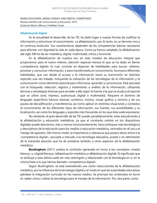 Este documento trata sobre la alfabetización digital y audiovisual. Explica que la alfabetización en el siglo XXI debe ser mediática, digital, multimodal, crítica y funcional. Define la "competencia digital" como la habilidad para buscar, obtener, procesar y comunicar información usando tecnologías de la información y comunicación. Sin embargo, advierte que el enfoque en la tecnología podría perjudicar la educación mediática y desviarla hacia aspectos más tecnológicos en lugar de críticos. Finalmente,