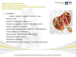 Este documento resume tres temas clave sobre las urgencias cardiovasculares: 1) la anatomía y fisiología del corazón, incluyendo su estructura, cavidades, presiones sanguíneas, y respuesta al sistema nervioso y ejercicio; 2) la electrofisiología cardíaca y características del electrocardiograma; 3) el registro electrocardiográfico en la sala de emergencias, con énfasis en la colocación de electrodos, análisis de derivaciones, y determinación de ritmo cardíaco.