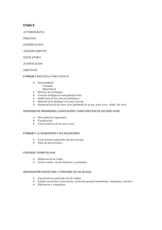 1) El documento presenta un portafolio de biología para el curso de nivelación general de la Universidad Técnica de Machala. 2) Incluye secciones como autobiografía, introducción, objetivos, y contenido sobre biología como ciencia, diversidad de organismos, clasificación, células, microscopio y más. 3) El portafolio cubre temas básicos de biología para preparar al estudiante para cursos universitarios de salud.