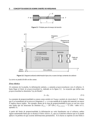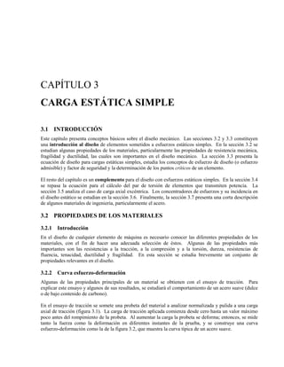 1) El documento presenta conceptos básicos sobre el diseño mecánico para elementos sometidos a esfuerzos estáticos simples. 2) Describe las propiedades de los materiales como resistencia mecánica, fragilidad y ductilidad, las cuales son importantes para el diseño. 3) Explica conceptos como curva esfuerzo-deformación, resistencia de fluencia, esfuerzo último, materiales uniformes, dúctiles y frágiles.
