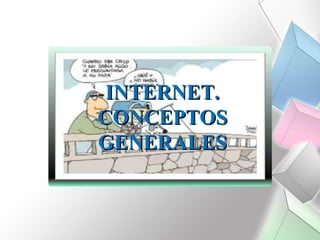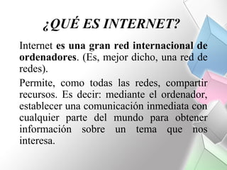 Internet es una gran red internacional de ordenadores que permite compartir recursos e información de forma inmediata desde cualquier parte del mundo. Surgió en los años 60 como ARPANET, una red creada por el Departamento de Defensa de EE.UU. para compartir recursos de forma descentralizada. ARPANET adoptó el protocolo TCP/IP que sigue usando Internet hoy en día para permitir la comunicación entre ordenadores con sistemas diferentes.