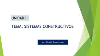 Este documento define los sistemas constructivos y describe varios tipos. Un sistema constructivo se define como el conjunto de elementos y unidades de un edificio que forman una organización funcional para proporcionar confort cuando se ejecutan con la técnica adecuada. Los sistemas se clasifican como tradicional, tradicional evolucionado, tradicional racionalizado e industrializado. Algunos sistemas específicos descritos incluyen mampostería, entramado de madera y paneles prefabricados.