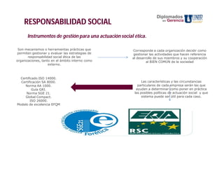 Este documento trata sobre los instrumentos de gestión para una actuación social ética en las organizaciones. Menciona herramientas como certificaciones ISO, normas y guías que permiten gestionar estrategias de responsabilidad social de manera interna y externa. También describe los sistemas de gestión ética, incluyendo el código de ética como expresión de los valores y principios morales de una organización. Explica el proceso de aplicación de un código de ética y sus beneficios internos y externos.