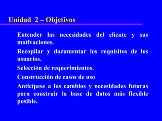 Este documento proporciona orientación sobre cómo realizar un plan para el desarrollo de una base de datos. Recomienda entender las necesidades del cliente mediante preguntas, observación de procesos actuales y consideración de posibles cambios futuros. También sugiere identificar a las partes interesadas clave y sus perspectivas, y ponerse en el lugar de los usuarios finales para comprender mejor sus necesidades.