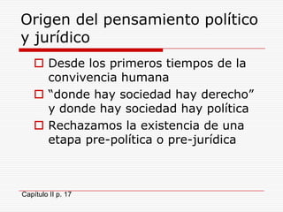 Este documento resume el origen y evolución del pensamiento político y jurídico desde las primeras sociedades humanas hasta la antigua Grecia. Explica que desde los primeros grupos humanos hace aproximadamente 1 millón de años, ha existido el derecho y la política como forma de organización social. Luego describe las principales teorías sobre el origen del derecho y la política, y cómo estas fueron evolucionando de lo sagrado y costumbrista a lo racional. Finalmente, analiza las obras y pensamientos de Platón y Aristóteles, dos de los primer