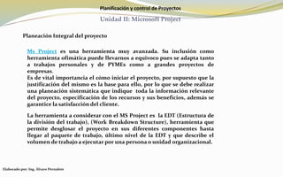 Este documento proporciona información sobre el uso de Microsoft Project para la planificación y gestión de proyectos. Explica cómo iniciar un nuevo proyecto en MS Project, establecer las propiedades y calendarios del proyecto, y crear y vincular tareas, hitos y tareas resumen. También cubre cómo estimar las duraciones de las tareas y establecer dependencias entre ellas.