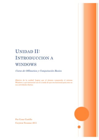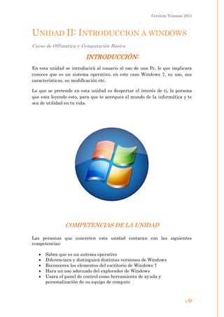 Este documento presenta una introducción al sistema operativo Windows. Explica que el objetivo de la unidad es que los estudiantes comprendan Windows y puedan interactuar con él de manera funcional. Describe las competencias que los estudiantes adquirirán, como saber qué es un sistema operativo, distinguir versiones de Windows, reconocer elementos del escritorio de Windows 7 y usar el panel de control.