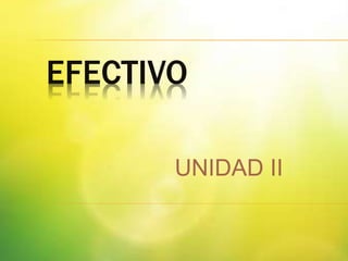 Este documento proporciona información sobre el concepto y manejo del efectivo en una empresa. Define efectivo como la moneda de curso legal en caja y depósitos bancarios disponibles. Explica que el efectivo generalmente se clasifica en caja chica y cuentas bancarias, y destaca la importancia de administrarlo adecuadamente a través de presupuestos y controles contables. También cubre temas como cuentas de cheques, fondos de caja, transacciones en moneda extranjera y principios de contabilidad aplicables.