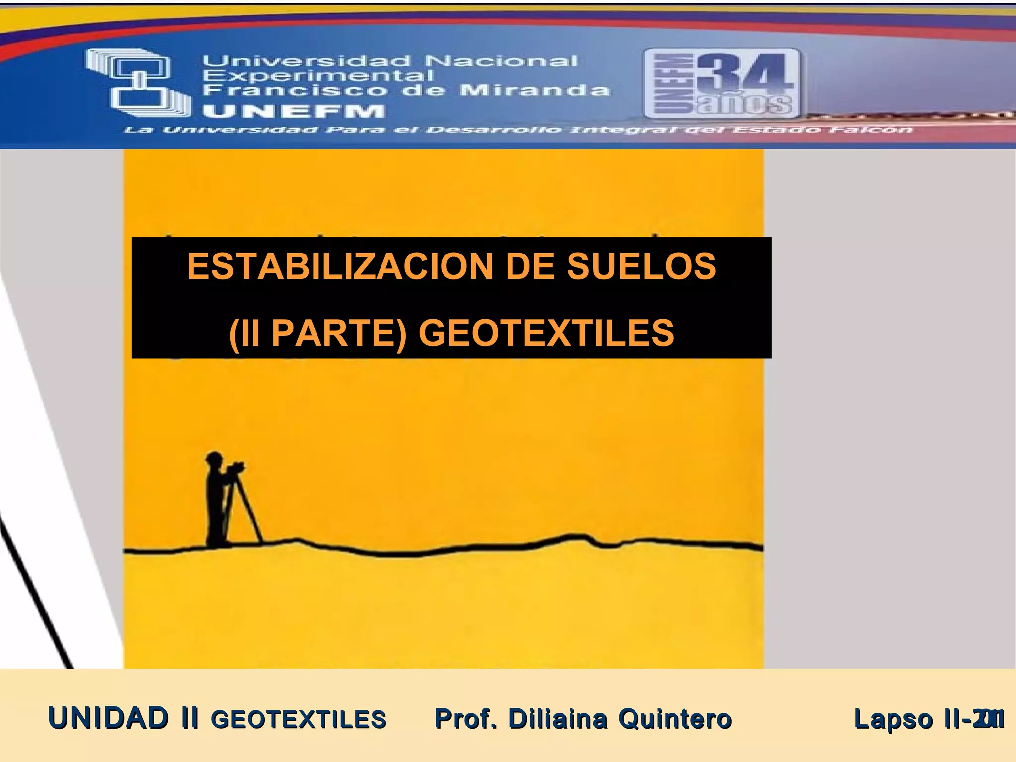 El documento habla sobre los geotextiles y sus funciones principales como la separación, filtración, drenaje y refuerzo de suelos. Explica que la separación mantiene la integridad de suelos adyacentes con diferentes propiedades impidiendo la migración. El refuerzo mejora las propiedades mecánicas del suelo. También describe brevemente la filtración, permitiendo el paso de agua pero no partículas sólidas, y da ejemplos de aplicaciones comunes de geotextiles como en carreteras, ferrov