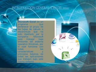 Este documento proporciona una introducción general a Microsoft Excel 2010, incluyendo descripciones del entorno de trabajo en Excel, formato de celdas, cambiar fuentes, alineación de celdas, relleno, bordes, estilos de celdas, operadores, fórmulas, funciones, funciones condicionales, funciones estadísticas, funciones de búsqueda, filtros, formato condicional y tablas dinámicas. Explica los conceptos y herramientas básicas de Excel para realizar cálculos y análisis