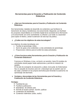 El documento discute herramientas digitales para la creación y publicación de contenido didáctico, destacando su utilidad para facilitar el aprendizaje online y su fácil acceso. Se mencionan características, ventajas y desventajas de estas herramientas, así como ejemplos específicos y estándares como SCORM e IMS. Además, se describe Exelearning, una herramienta significativa para el desarrollo de materiales educativos, que permite a los docentes crear y publicar contenido accesible.