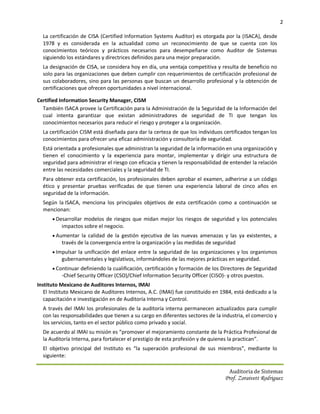El documento describe las mejores prácticas de auditoría en sistemas de información según organismos internacionales como ISACA e IIA. ISACA ofrece las certificaciones CISA y CISM para auditores y gerentes de seguridad de TI, respectivamente. El IIA ofrece la certificación CIA para auditores internos. Estas certificaciones demuestran los conocimientos y habilidades necesarias en la profesión.
